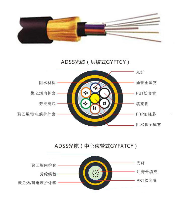 漢信ADSS 光纜采用松套層絞式結(jié)構(gòu),將 250μm 光纖套入高模量材料制成的松套管中,松套管內(nèi)填充防水化合物。松套管(和填充繩)圍繞非金屬中心加強芯(FRP)絞合成緊湊的纜芯,纜芯的縫隙充以阻水油膏。纜芯外擠制聚乙烯(PE)內(nèi)護套,然后絞合起加強作用的芳綸,最后擠制聚乙烯(PE)外護套或耐電痕(AT)外護套。