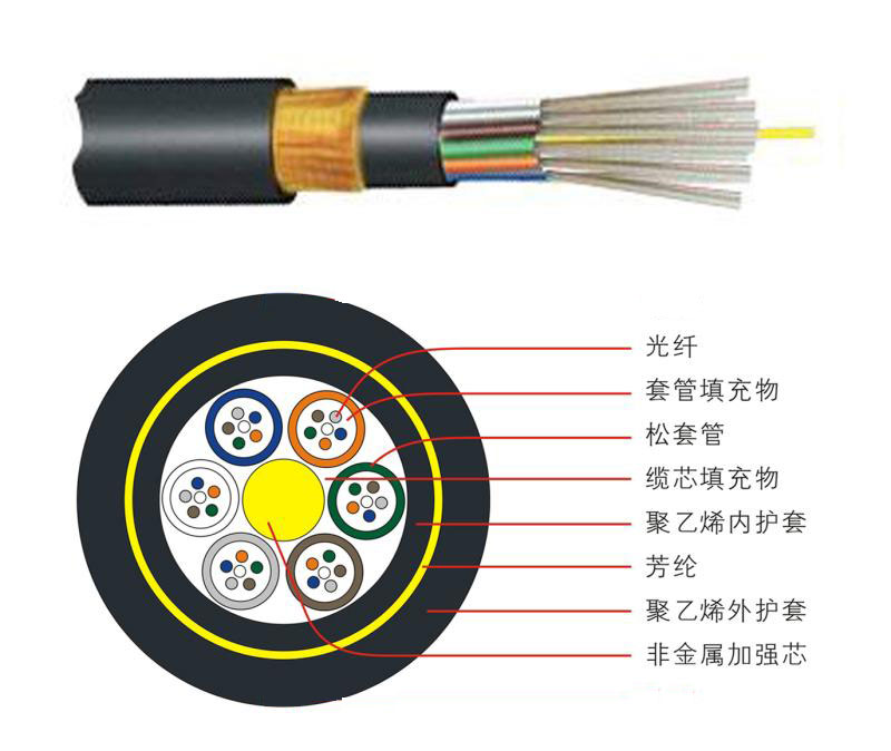 GYHTY 光纜的結(jié)構(gòu)是將 250μm 光纖套入高模量材料制成的松套管中,松套管內(nèi)填充防水化合物。纜芯的中心是一根玻璃纖維增強(qiáng)塑料(FRP),松套管(和填充繩)圍繞中心加強(qiáng)芯絞合成緊湊和圓形的纜芯 。纜芯內(nèi)的縫隙充以阻水油膏后擠制聚乙烯內(nèi)護(hù)套,再包上一層芳綸后擠制聚乙烯外護(hù)套成纜。