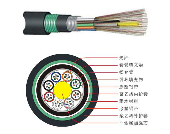 漢信 GYFTA53 光纜的結(jié)構(gòu)是將 250μm 光纖套入高模量材料制成的松套管中,松套管內(nèi)填充防水化合物。纜芯的中心是一根非金屬加強(qiáng)芯(FRP),對于某些芯數(shù)的光纜來說, 非金屬加強(qiáng)芯外還需要擠上一層聚乙烯(PE)。松套管(和填充繩)圍繞中心加強(qiáng)芯絞合成緊湊和圓形的纜芯,纜芯內(nèi)的縫隙充以阻水填充物。涂塑鋁帶(APL)縱包后擠一層聚乙烯內(nèi)護(hù)套,雙面涂塑鋼帶(PSP)縱包后擠制聚乙烯護(hù)套成纜。
