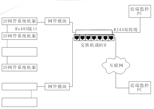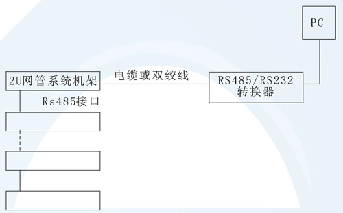 該結(jié)構(gòu)可通過(guò)通用RS485RS232轉(zhuǎn)換器,實(shí)現(xiàn)網(wǎng)管服務(wù)器對(duì)網(wǎng)絡(luò)的近程監(jiān)控。