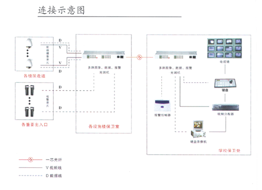 在校園監(jiān)控系統(tǒng)中由于校區(qū)大樓多、樓層高,布線復(fù)雜,而且遠距離主要監(jiān)控中心遠,給監(jiān)控傳輸帶來了種種困難。因此將視頻,音頻,控制以及報警信號集中傳輸?shù)礁鱾保衛(wèi)室,然后保衛(wèi)室之間通過HS-VADE系列視頻、音頻、數(shù)據(jù)光端機來實現(xiàn)傳輸,解決校園的安全防范工作。