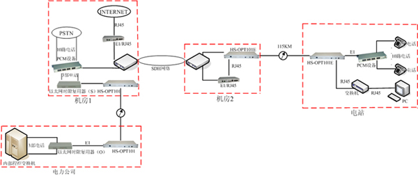 該方案采用我公司生產(chǎn)的PDH光端機(jī)、PCM設(shè)備、以太網(wǎng)時隙復(fù)用器,協(xié)議轉(zhuǎn)換器.實現(xiàn)了電力公司內(nèi)部電話和外部電話的延長,同時解決了以太網(wǎng)的接入和監(jiān)控數(shù)據(jù)的傳輸!